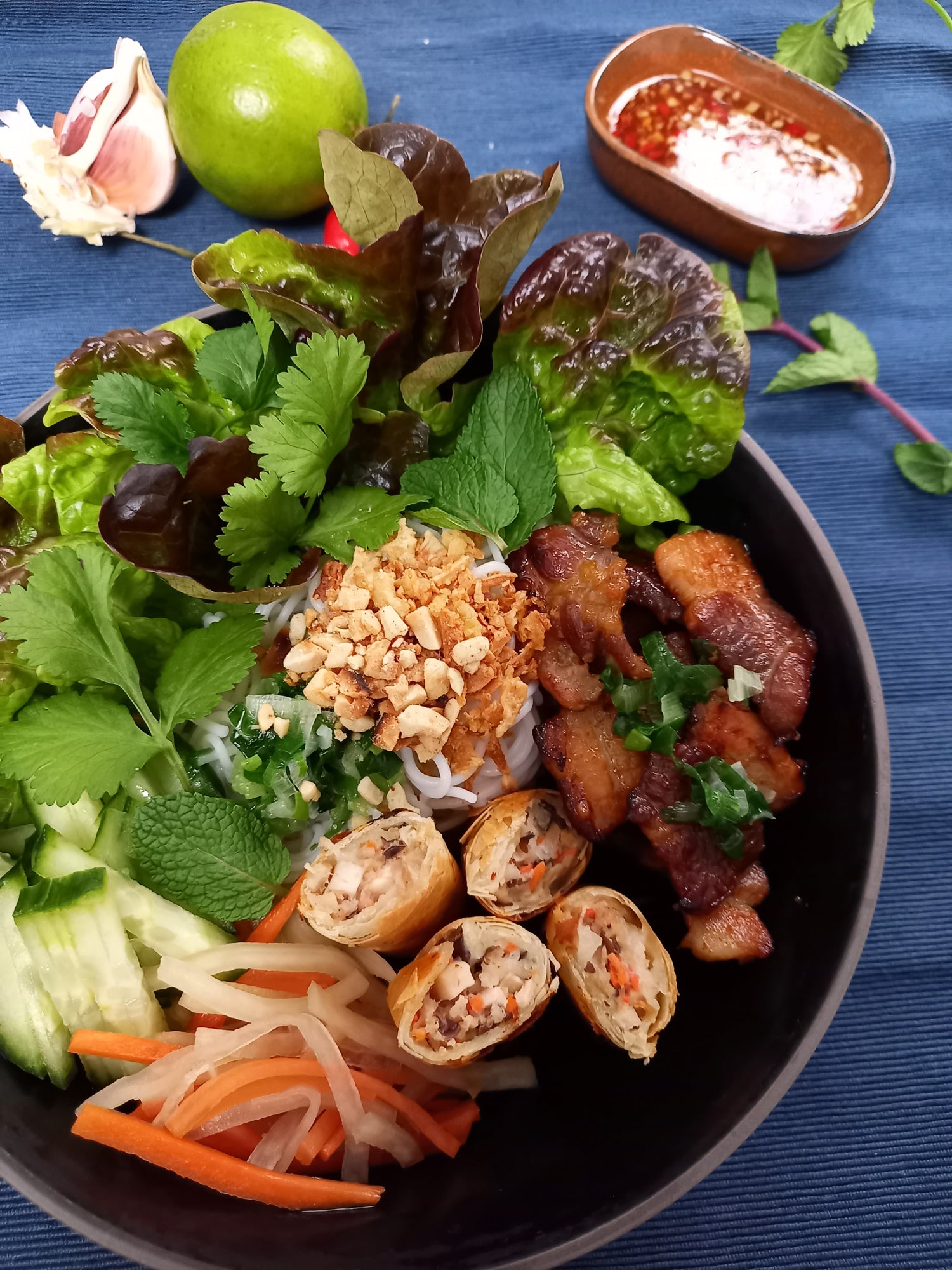 Veggie loempia's, gedroogde noedels, sla, gepekelde wortelen en witte radijs, komkommer, sojascheuten, munt, koriander (kan zonder), lente uitjes, gebakken uitjes, pindanoten (kan zonder)