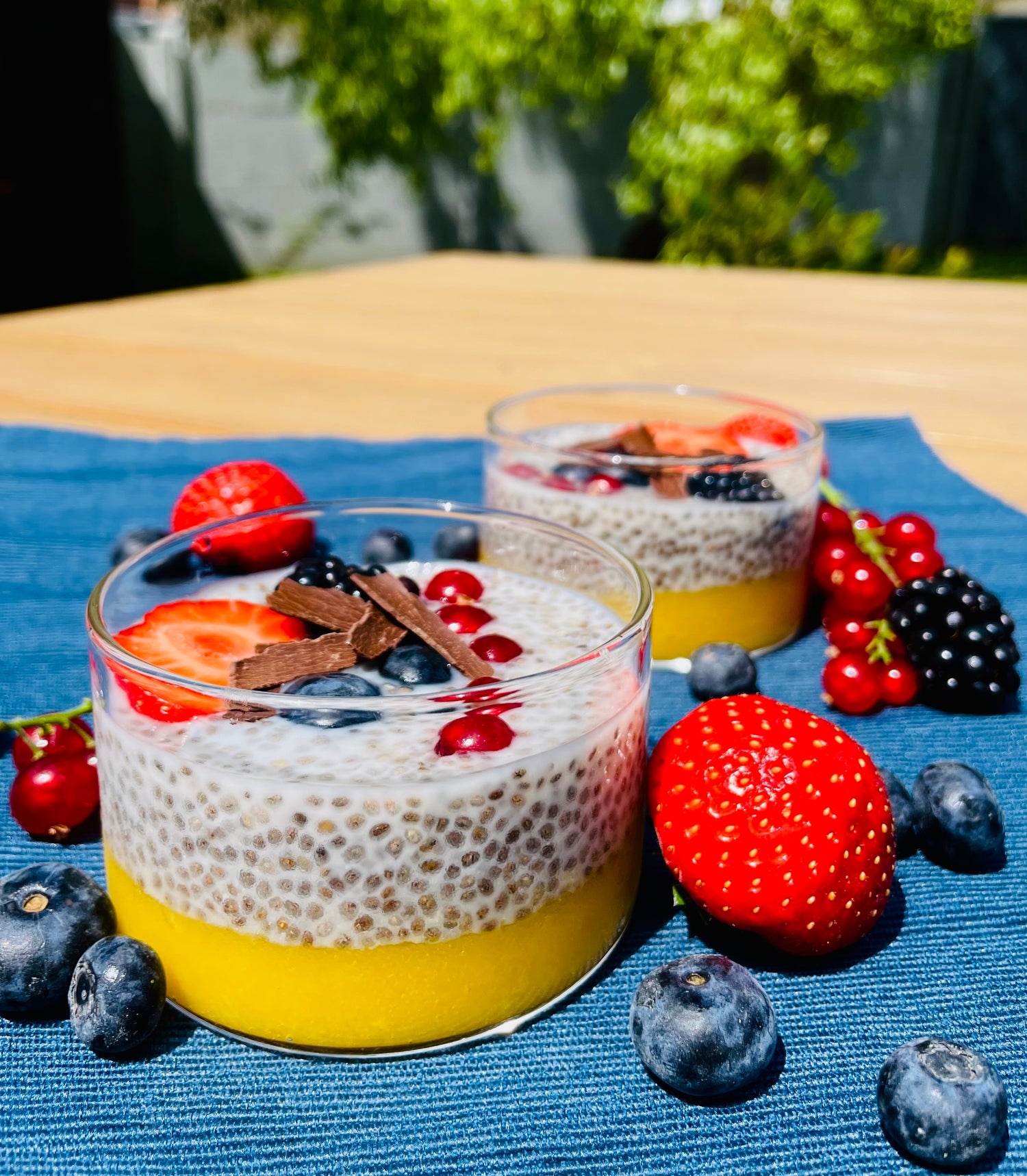 Gepureerde verse mango, chia pudding in kokosmelk, verse vruchten en chocolade snippers.