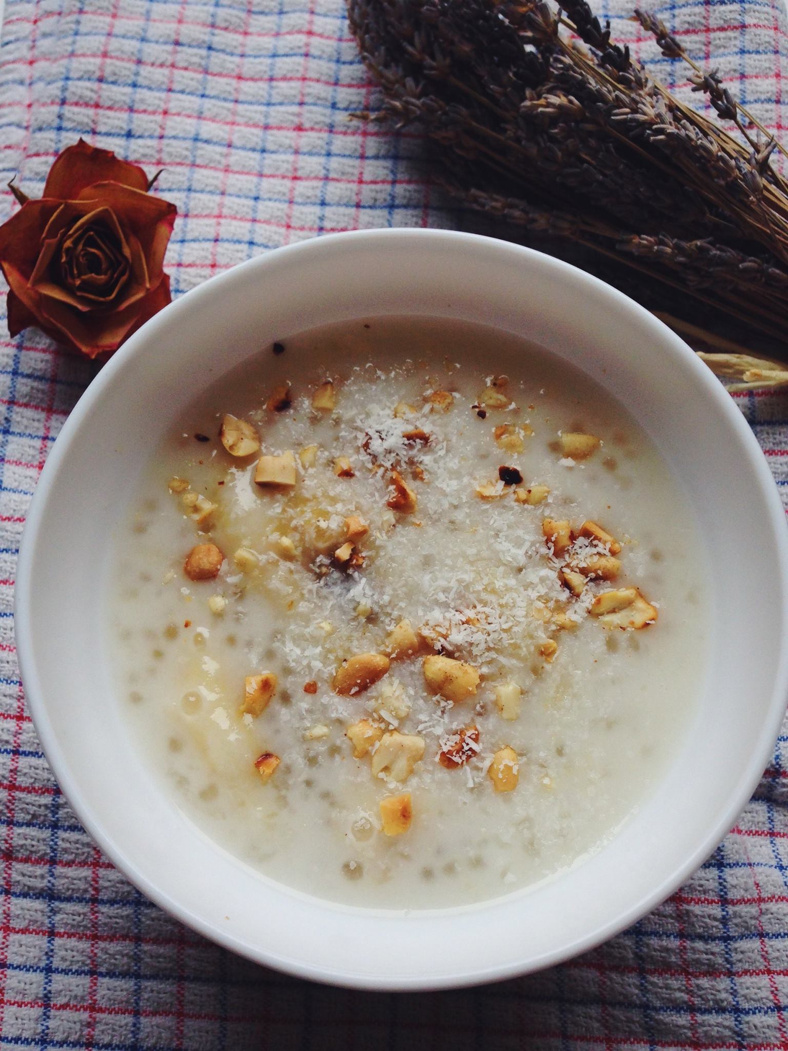 Een typisch Vietnamese dessert waarbij de banaan langzaam wordt gekookt in kokosmelk, afgetopt met gemalen pinda en kokosvlees. Het dessertje wordt warm geserveerd.
